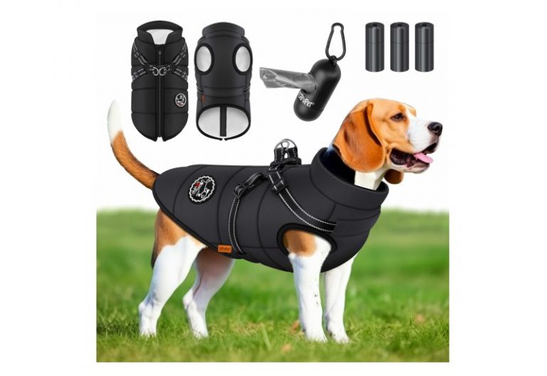 💰 Nur 25,80€ statt 44,80€ 📍 Hundejacke Hundemantel mit Geschirr, inkl. 45 Stück Kotbeutel + Spender, Hunde Winterweste gefüttert wasserdicht,…