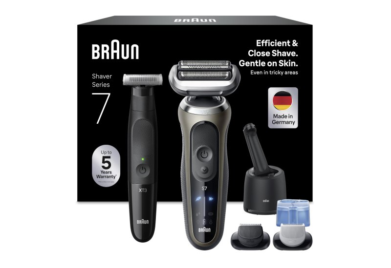 📍 Braun Bundle mit Series 7 Rasierer Herren Elektrisch, Kabelloser Nass- & Trockenrasierer Männer, Made in Germany, 72-C7650cc, Gold + Series XT3 Gesicht & Körper, Elektrischer Rasierer, XT3200, Schwarz