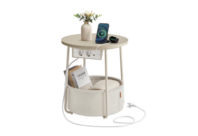 📍 VASAGLE Beistelltisch rund, Kleiner Tisch, Couchtisch mit Steckdose, Wohnzimmertisch, Korb aus Stoff, Stauraum für Wohnzimmer Schlafzimmer, Nachttisch modern, naturbeige-cremeweiß LET228LL01