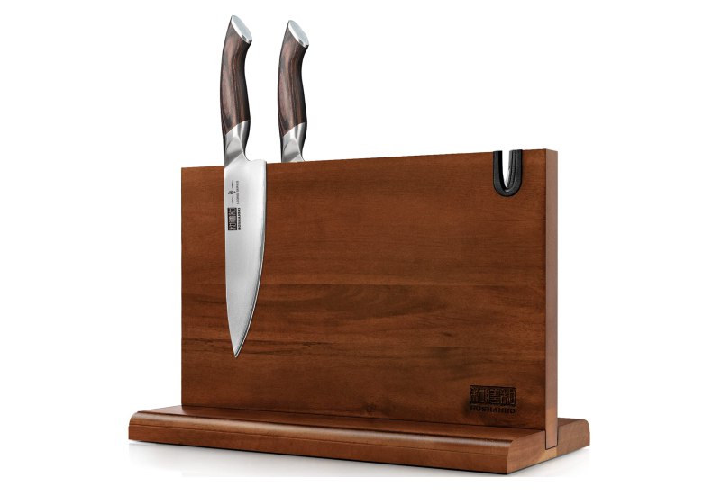📍 HOSHANHO Messerblock Magnetisch mit Schärfer, Doppelseitiger Starker Magnetischer Messerhalter, Natürlichem Akazienholz-Magnet Messerhalter für Küche