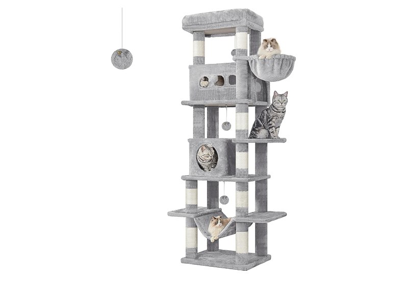 📍 Hzuaneri Kratzbaum groß, 170 cm hoch, Katzenbaum, mit 8 Kratzbäume, 2 Höhlen, groß Plattformen, Waschbare Matte, Hängematte, Plüschbälle, mehrstöckiger katzenkratzbaum, Hellgrau MS17018LG