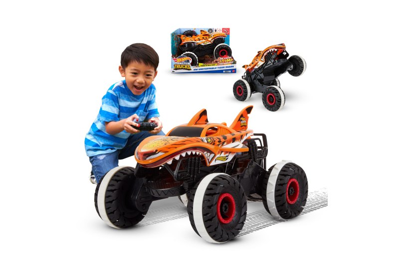 📍 Hot Wheels Monster Trucks Ferngesteuertes Auto Tiger Shark, mit ‚Terrain Stomp‘ Technologie für tierähnliche Bewegungen, Wheelie Modus für Drehen auf 2 Rädern, Spielzeug ab 4 Jahre, HGV87