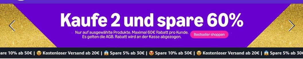 Aktuelle Deals30. November 2025Kanal Angebot Kaufe min. 2 Produkte bei Haul und spare 60%. Viele tolle Produkte für den Alltag verfügbar. …mehr auf Amazon*