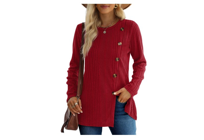 📍 XIEERDUO Pullover Damen Herbst Winter Strickpullover Damen Rundhals Langarmshirt Damen Schlitz Tunika Top Damen mit Knöpfen Oberteile Elegant Rot M