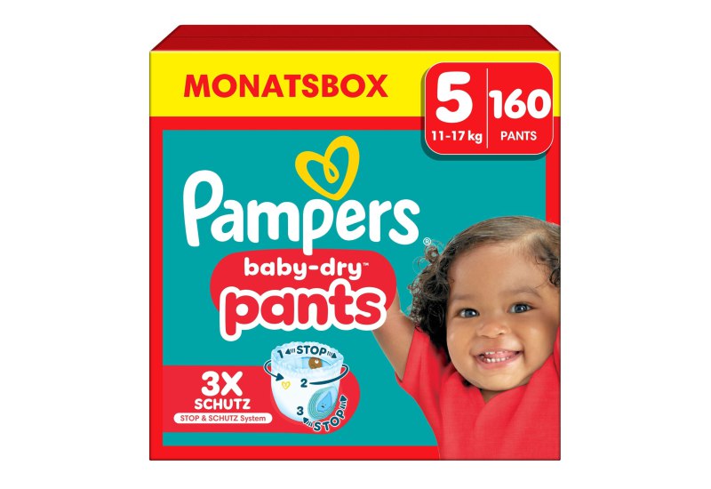 📍 Pampers Baby-Dry Pants Größe 5, 160 Windeln, 11kg-17kg, 360° Passform hilft, Auslaufen zu verhindern