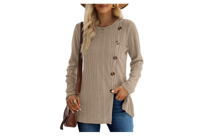 📍 XIEERDUO Pullover Damen Herbst Winter Strickpullover Damen Rundhals Langarmshirt Damen Schlitz Tunika Top Damen mit Knöpfen Oberteile Elegant
