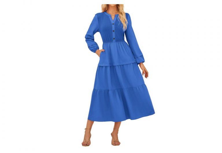 💰 Nur 19,50€ statt 48,99€ 📍 GRACE KARIN Damen Langarm Henley V-Ausschnitt Kleid mit Kontrastgewebe Elastische Taille A-Linie Midikleid mit…